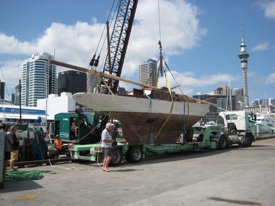 Lifting Kotiri from the crane barge on to the road transporter at Westhaven