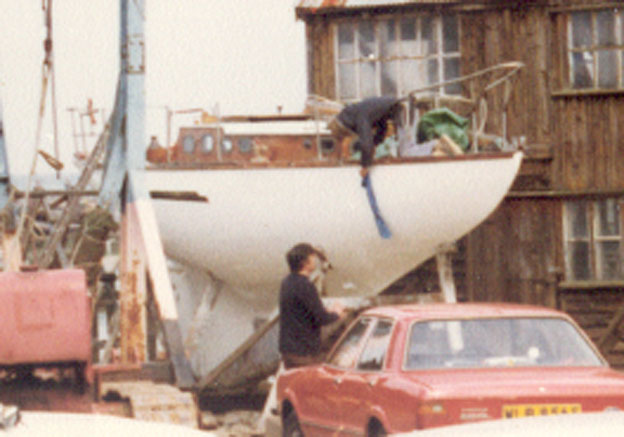 1978 at Tollesbury when rigged as a family cruiser under the name 'Saxon'. Picture shows large cabin-top, stancions, pulpit, pushpit etc when under previous ownership