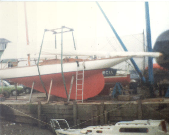 1985. On the hard at Dan Webb & Feesey, Maldon. Waiting to be launched after her first rebuild and with her new gaff rig, and her old name 'Asti V' resurrected again.