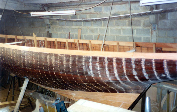 The new top strakes and all planking now completed. All screws are counterbored and wooden plugged. This shot clearly shows the hundreds of glued wooden plugs waiting to be trimmed